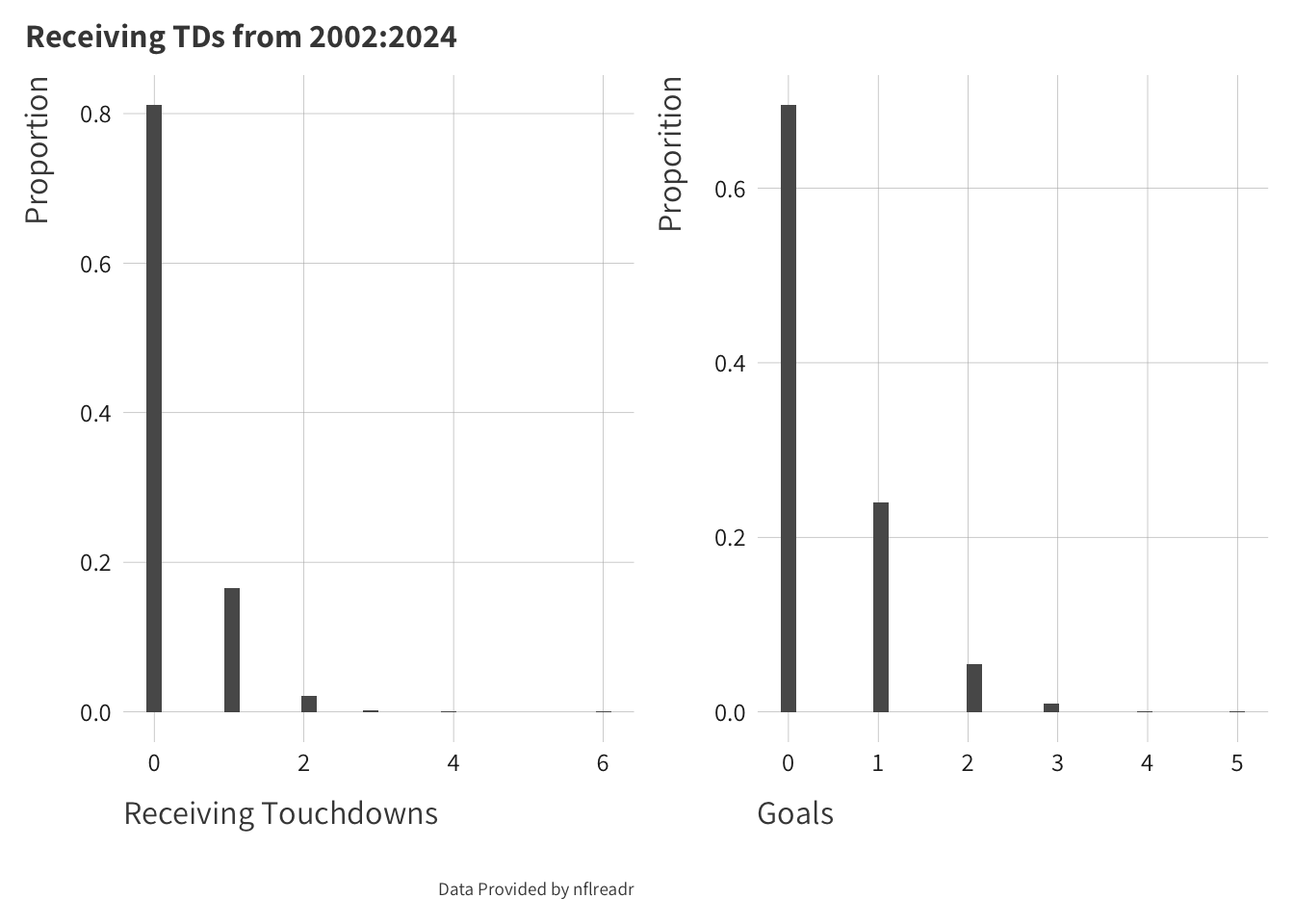 After reading through the example notebooks and the paper, I thought that this was not only an interesting idea, but it would probably have a strong crossover with touchdowns in football. In Figure 1 I plot a comparison of receiving touchdowns in nflreadr versus goals in the author’s data. The data that are used in the goals plot are a subset of the data that they use in their Sloan analytics paper. From my very limited knowledge of Soccer most o,f these guys seem pretty good, so we are likely to see more players with one goal. Whereas in the NFL play-by-play data, we have a full accounting of every touchdown scored from 2002-2024.4