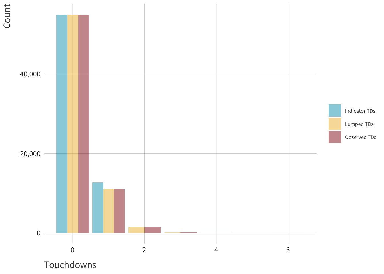 hist_dat = empirical_dat |>mutate(binary =ifelse(rec_tds >=1, 1, 0)) |>pivot_longer(c(rec_tds, rec_tds_game, binary)) |>mutate(name =case_when( name =='rec_tds_game'~'Observed TDs', name =='rec_tds'~'Lumped TDs', name =='binary'~'Indicator TDs' ) )ggplot(hist_dat, aes(x = value, fill = name)) +geom_bar(alpha =0.5, position ='dodge') +labs(x ='Touchdowns', y ='Count', fill =NULL) + MetBrewer::scale_fill_met_d(name ='Lakota') +scale_y_continuous(labels = scales::comma)