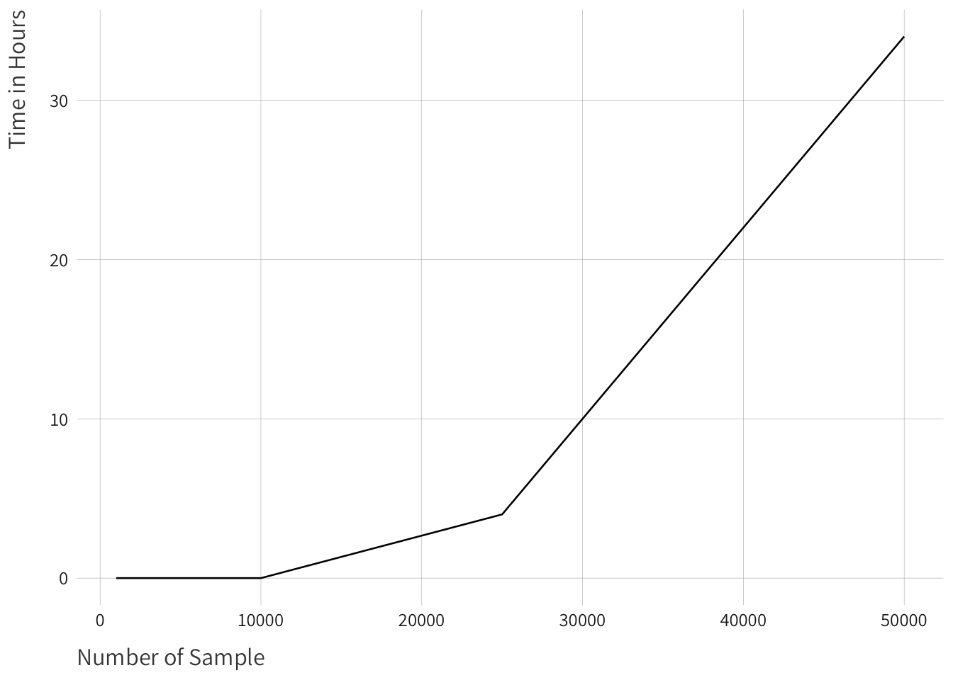 To model time, I make use of Hilbert Space Gaussian Processes (HSGP). Most of the textbook definitions of a Gaussian Process (GP) start with the idea that this is a wholly uninformative name. Effectively, a Gaussian process is a collection of random variables where any finite subset has a Gaussian distribution. It is effectively just an infinite vector a.k.a a function where we are going to place a prior over. Generally, Gaussian processes are used to model time or space or both. Mathematically, this involves a lot of matrix inversion to get the posterior covariance. What this means practically is that the execution is \(O(n^3)\) to get a sense of what that means, I plotted how long it would take to fit a single Gaussian process. Game level NFL data is not necessarily all that big but there are about 2080 games in the nflreadr database, without including the play-by-play data where we are including data from just about every wide receiver to take a snap. To get around having to wait 30+ hours to fit a model we can use a lower level approximation of GP known as a HSGP. We are using an approximation of a GP where we use basis to capture the wiggliness of the function while basically converting everything from a matrix inversion to matrix multiplication which is a much faster operation.
