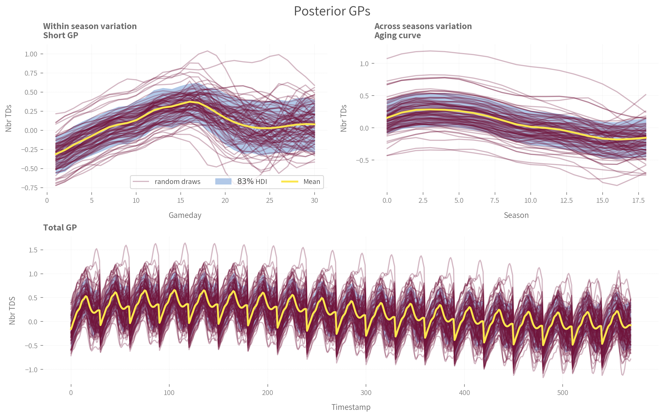 The biggest difference that I found when changing the goal scoring model to the touchdown scoring model was dealing with time. The soccer season is considerably longer than the football schedule, with 38 matchdays, while the length of the football season ranges from 14-17 games over the course of NFL games. Fitting two GPs into one season is feasible but a little bit overkill. Careers in the NFL also tend to be a bit shorter than in European high-level soccer. In general, an NFL career is 3ish years whereas the career lengths in European high-level soccer are longer because there are more avenues available to develop a player.