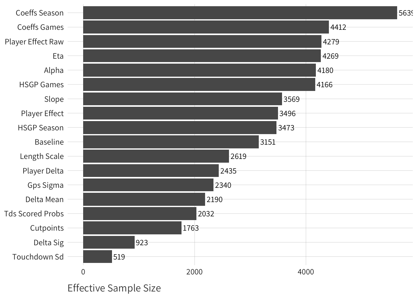 Personally, I would have really liked everybody to be above 1,000. The sigma for the touchdown’s parameter is pretty small ESS of 519, but we are still a bit above the threshold where PyMC will yell at you.