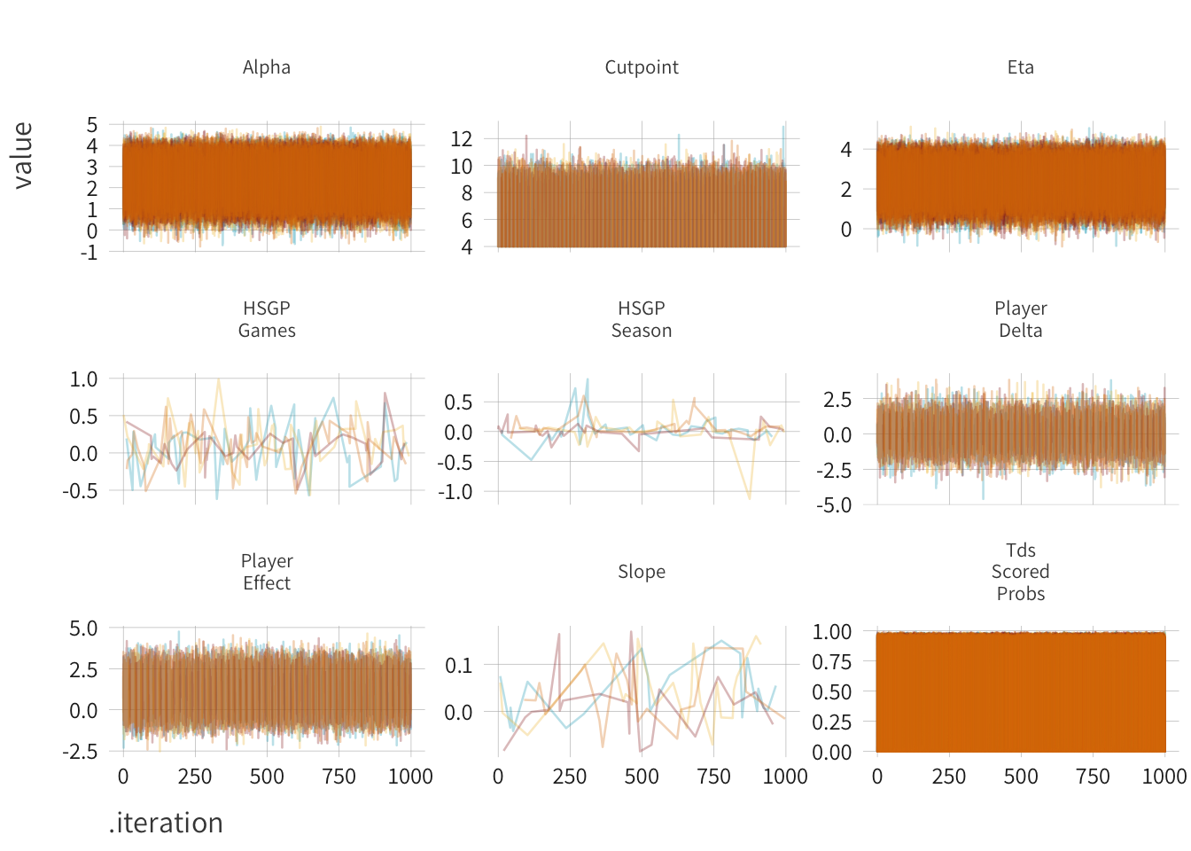 Working with the posteriors from this model is not necessarily difficult but because there are 2265 with 1,000 draws across four chains and a few parameters that are indexed by player, this can take a while. To speed up compilation of the graphs, I do make some quick and dirty trace plots by taking a random sample of values for each variable across each chain.