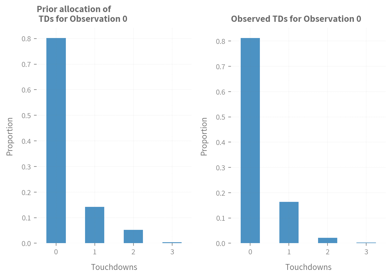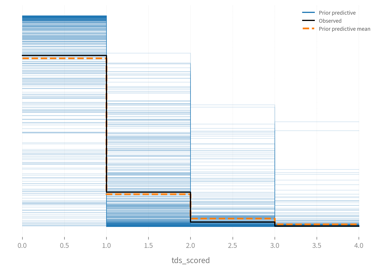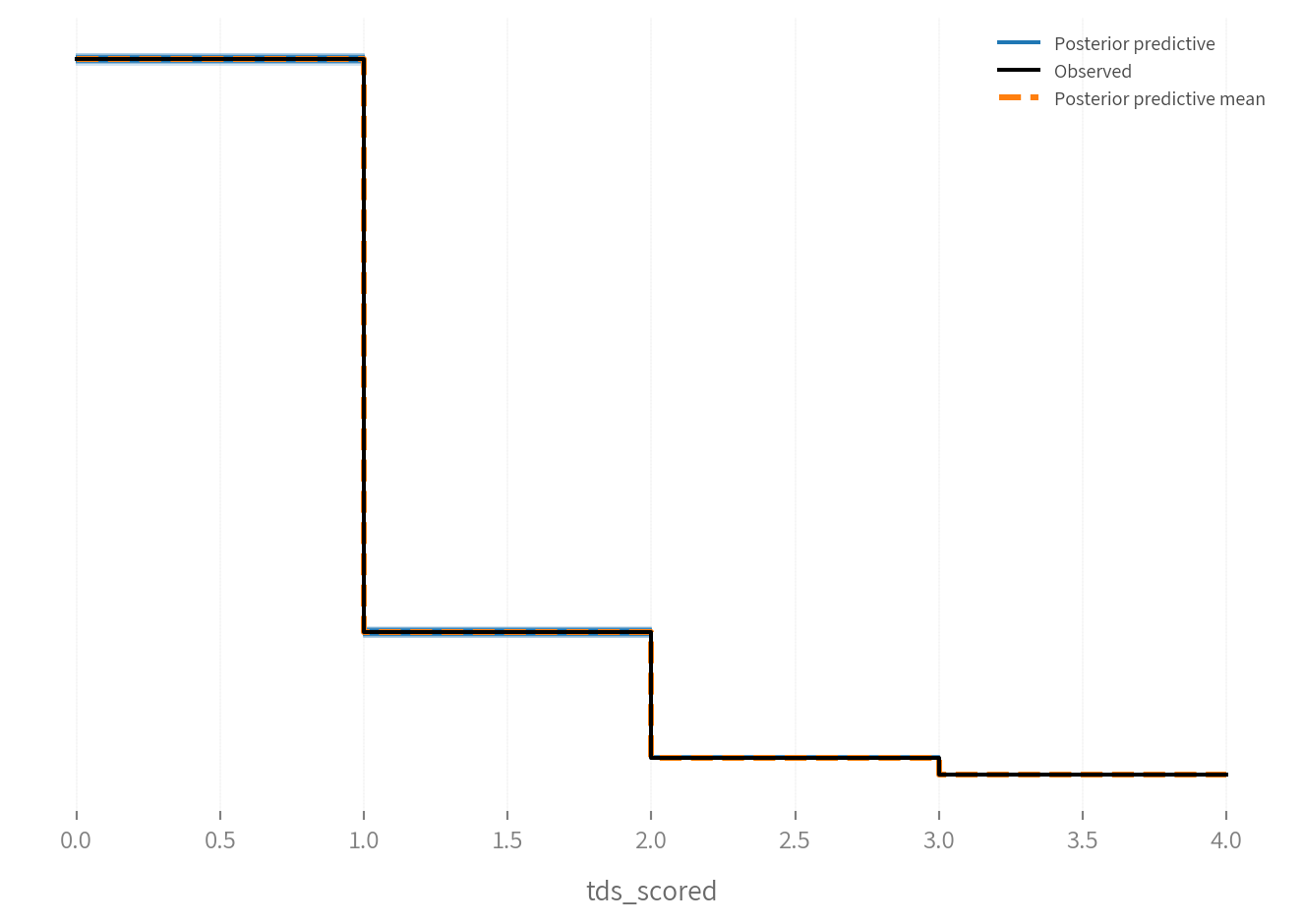 We can see that a little bit more clearly when we visualize the prior predictive distribution. The model underpredicts zero by a bit, while it gets one touchdown pretty close to dead on. Overall, I think the model looks acceptable. We could try and dial everything in a whole lot more, but that feels like playing with fire.