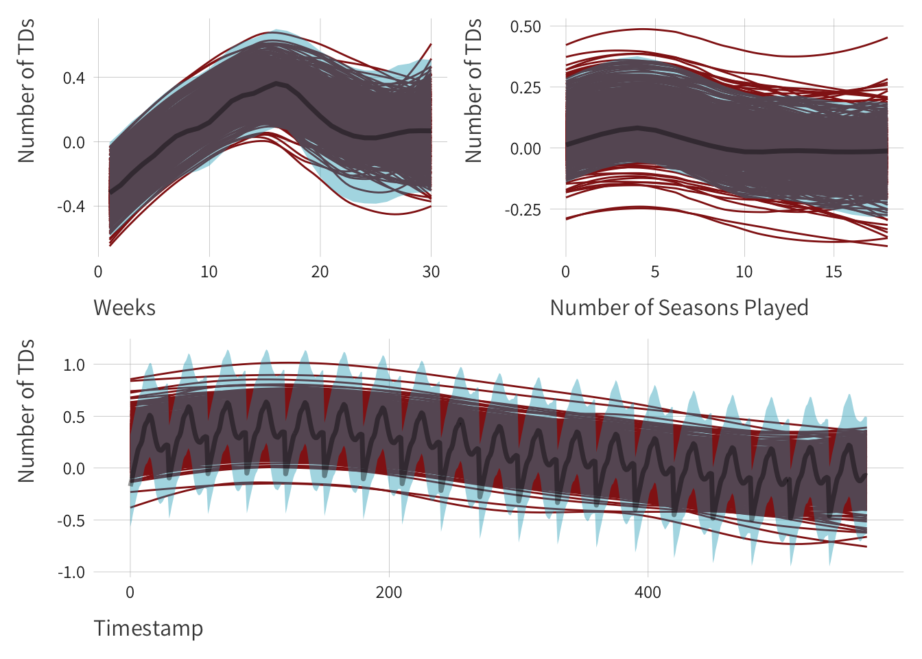 # this is just to please ggdistseasons_hsgp =read_parquet('writeup-dat/seasons-hsgp.parquet') |>rename(.chain = chain, .iteration = draw) |>mutate(.draw =row_number()) |>slice_sample(n =50, by = .draw)games_hsgp =read_parquet('writeup-dat/games-hsgp.parquet') |>rename(.chain = chain, .iteration = draw) |>mutate(.draw =row_number())total_hsgp =read_parquet('writeup-dat/total_hsgp.parquet') |>rename(.chain = chain, .iteration = draw)clrs =met.brewer(name ='Lakota')g =ggplot(games_hsgp, aes(x = gameday, y = f_games)) +geom_smooth(aes(group = .iteration),se =FALSE,alpha =0.3,color = clrs[3],linewidth =0.5 ) +stat_lineribbon(.width = (0.89), alpha =0.4, fill = clrs[1]) +labs(x ='Weeks', y ='Number of TDs')s =ggplot(seasons_hsgp, aes(x = seasons, y = f_season)) +geom_smooth(aes(group = .iteration),se =FALSE,alpha =0.3,color = clrs[3],linewidth =0.5 ) +stat_lineribbon(.width = (0.89), alpha =0.4, fill = clrs[1]) +labs(x ='Number of Seasons Played', y ='Number of TDs')t =ggplot(total_hsgp, aes(x = timestamp, y = x)) +geom_smooth(aes(group = .iteration),se =FALSE,alpha =0.3,color = clrs[3],linewidth =0.5 ) +stat_lineribbon(.width = (0.89), alpha =0.4, fill = clrs[1]) +labs(x ='Timestamp', y ='Number of TDs')(g + s) / t