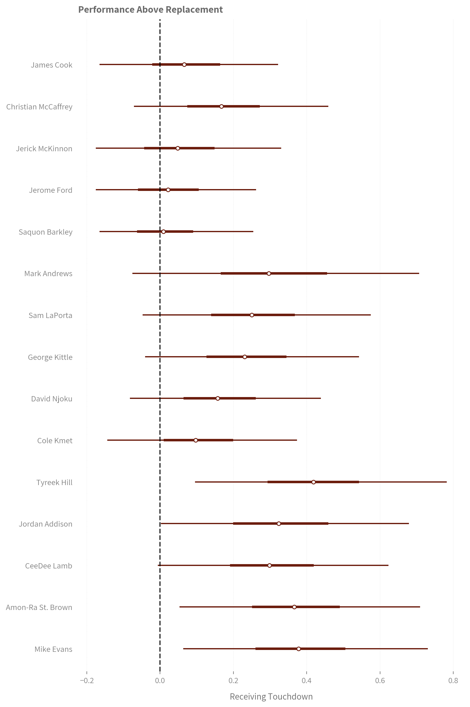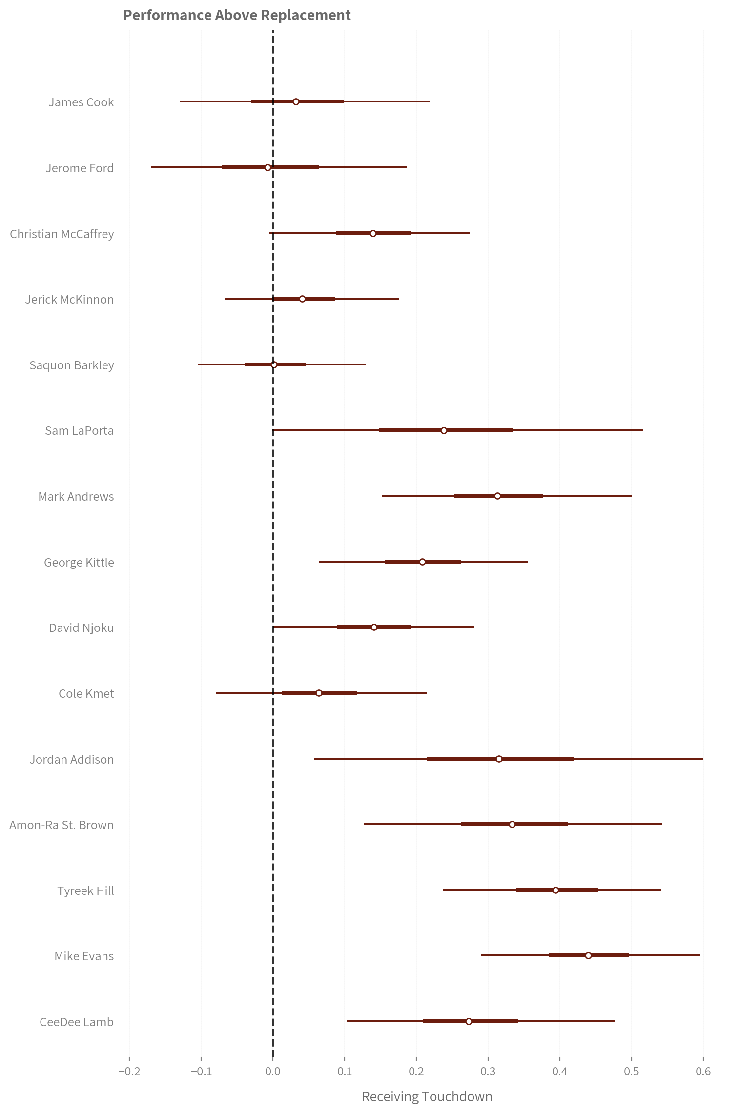 Let’s first look at the season-level information about play above replacement. What is genuinely interesting to me is that, as a receiving scoring threat, Christian McCaffrey is mostly replaceable despite scoring 7 receiving touchdowns, which was a career high. Interestingly, we don’t have a ton of TEs that are super valuable despite a lot of LaPorta’s fantasy production coming from TDs in his rookie season. Interestingly, the RBs all have their Performance Above replacement, like right on the line. I think that this may just be telling us that as pass catchers, there probably isn’t a ton of additional value.