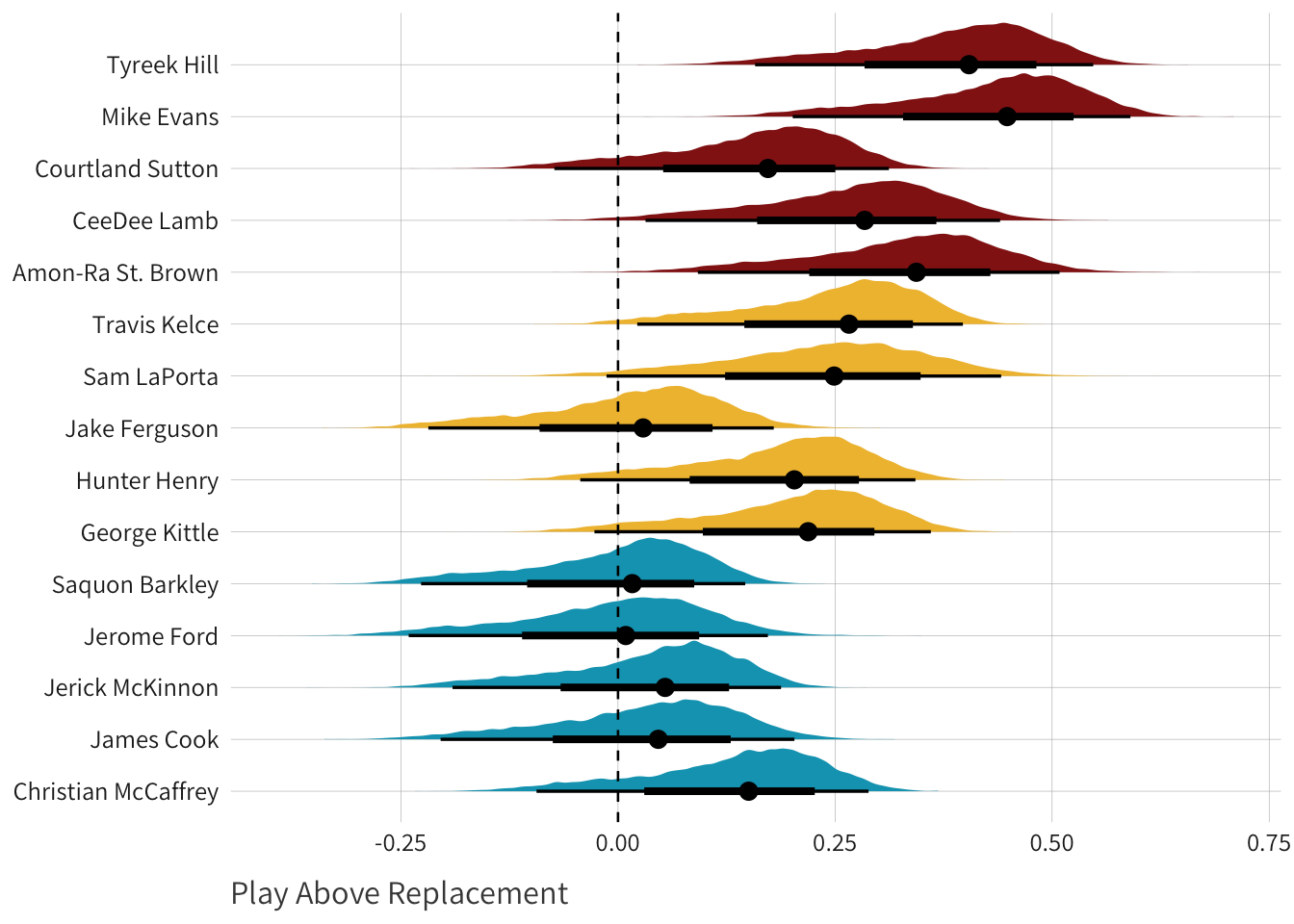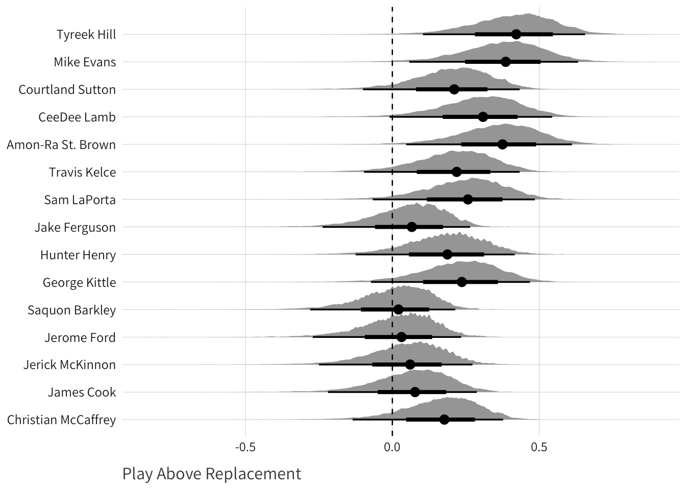 What happens when we disregard the season-specific parameter? We do see some big jumps in value for almost everybody! This definitely makes more sense since Christian McCaffrey is generally regarded as a really good pass catcher, but especially at his position. Sam LaPorta has a bit more volatility than Hunter Henry and George Kittle, since, in the data, he is only a 2nd year player, so we just have less information about him.