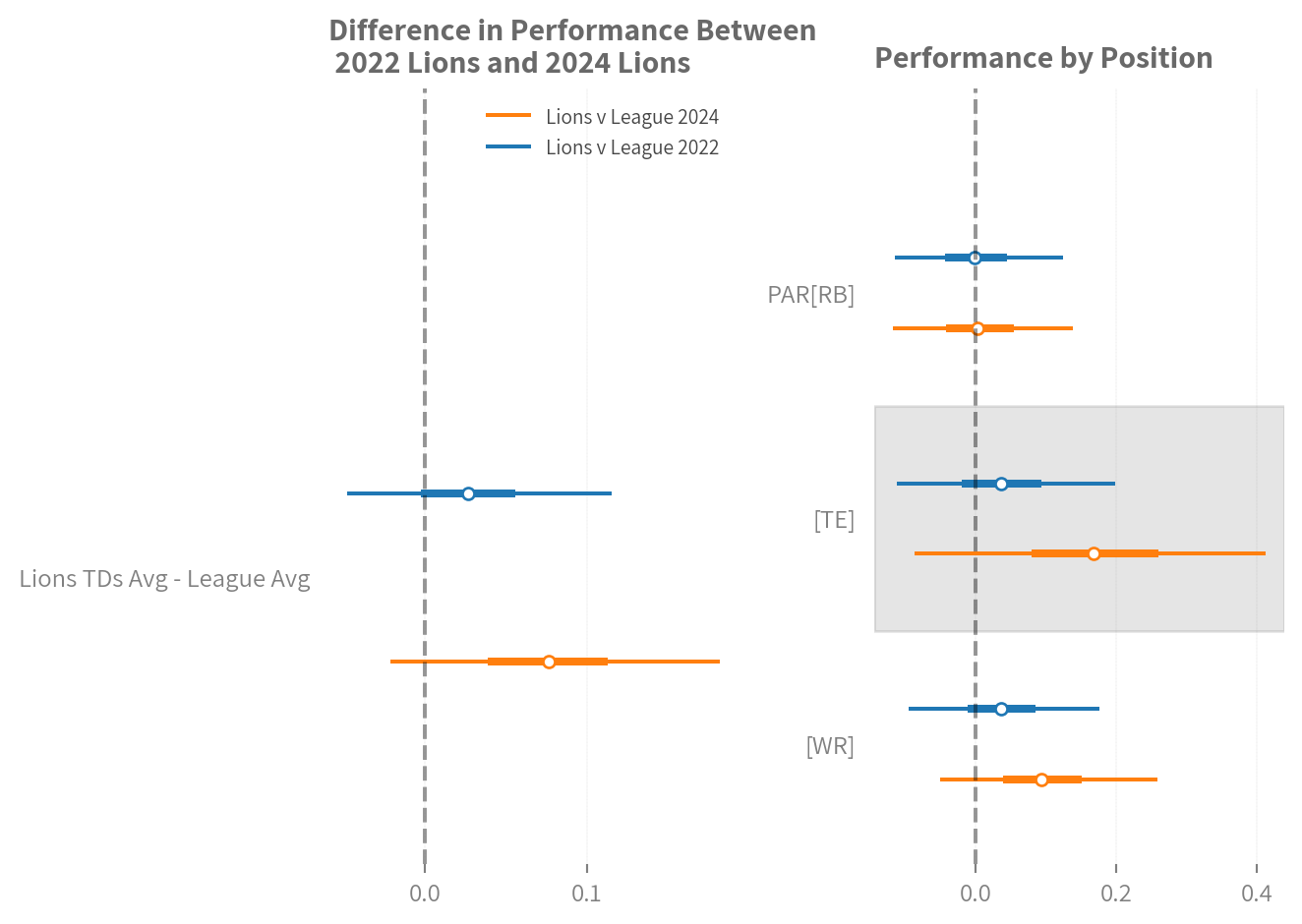 players_2022 = cumulative_stats.filter( (pl.col('posteam') =='DET') & (pl.col('season') ==2022)).select( pl.col('receiver_full_name').unique())['receiver_full_name'].to_list()players_2024 = cumulative_stats.filter( (pl.col('posteam') =='DET') & (pl.col('season') ==2024)).select( pl.col('receiver_full_name').unique())['receiver_full_name'].to_list()perf_2022 = post_preds['tds_scored'].where( ( (post_preds['receiver_full_name'].isin(players_2022))& (post_preds['season'] ==2022) ), drop =True)perf_2024 = post_preds['tds_scored'].where( ( (post_preds['receiver_full_name'].isin(players_2024))& (post_preds['season'] ==2024) ), drop =True)league_2022 = post_preds['tds_scored'].where( ( (post_preds['season'] ==2022) & (~post_preds['receiver_full_name'].isin(players_2022)) ), drop =True)league_2024 = post_preds['tds_scored'].where( ( (post_preds['season'] ==2024) & (~post_preds['receiver_full_name'].isin(players_2024)) ), drop =True)team_avg_2022 = perf_2022.mean('obs_id')team_avg_2024 = perf_2024.mean('obs_id')league_avg_2022 = league_2022.mean("obs_id")league_avg_2024 = league_2024.mean('obs_id')league_pos_avg_2022 = league_2022.groupby(["receiver_position"]).mean('obs_id') league_pos_avg_2024 = league_2022.groupby(['receiver_position']).mean('obs_id')lions_pos_avg_2022 = perf_2022.groupby(["receiver_position"]).mean('obs_id')lions_pos_avg_2024 = perf_2024.groupby(['receiver_position']).mean("obs_id")pos_contrast_2022 = (lions_pos_avg_2022 - league_pos_avg_2022).rename('PAR')pos_contrast_2024 = (lions_pos_avg_2024 - league_pos_avg_2024).rename('PAR')Lions_League_2022 = (team_avg_2022 - league_avg_2022).rename('Lions TDs Avg - League Avg')Lions_League_2024 = (team_avg_2024 - league_avg_2024).rename('Lions TDs Avg - League Avg')_,(right, left) = plt.subplots(1,2)az.plot_forest([Lions_League_2022, Lions_League_2024], model_names = ['Lions v League 2022', 'Lions v League 2024'], combined =True, ax = right)az.plot_forest([pos_contrast_2022, pos_contrast_2024], model_names = ['Lions v League 2022', 'Lions v League 2024'], combined =True, ax = left )right.set( title ='Difference in Performance Between \n 2022 Lions and 2024 Lions')left.set( title ='Performance by Position')right.axvline(c ='k', ls ='--', alpha =0.4)left.axvline(c ='k', ls ='--', alpha =0.4)left.get_legend().remove()