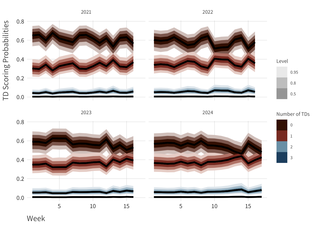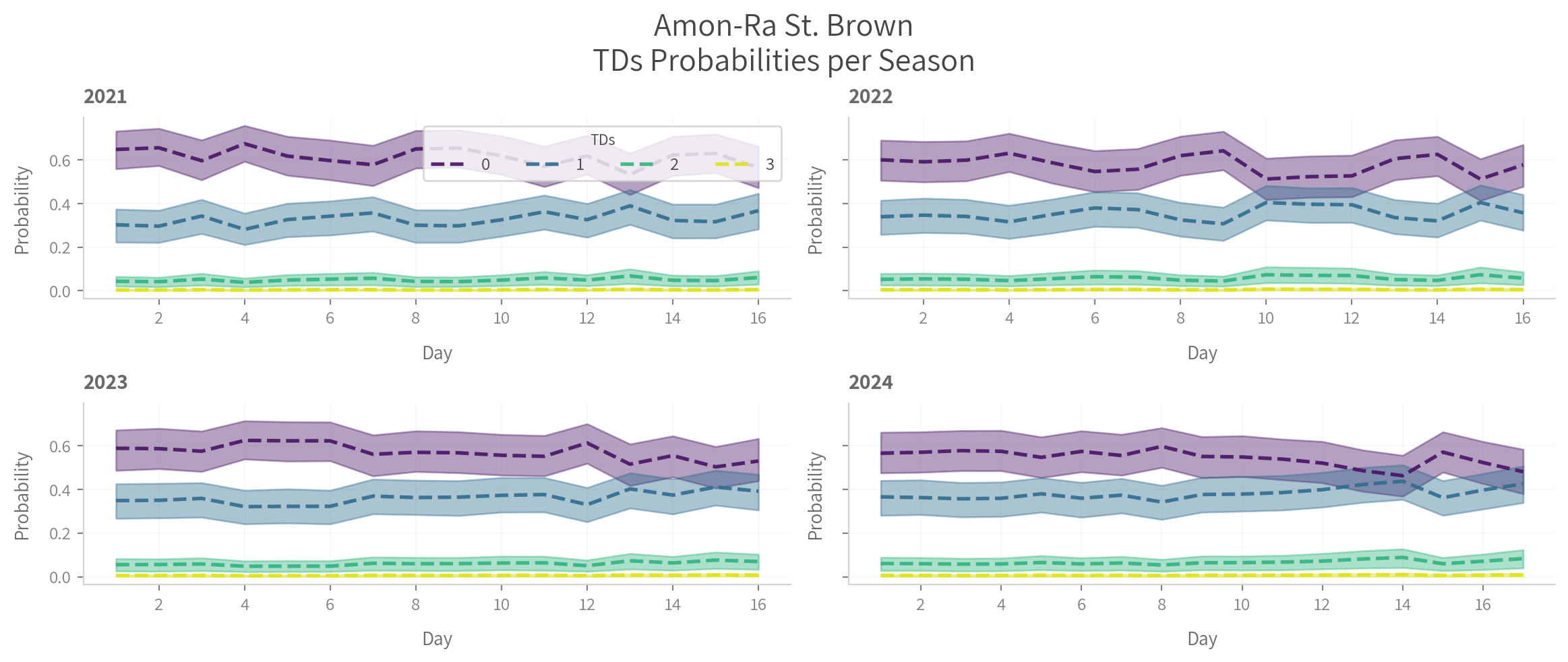 If we want to see the evolution of a pass catcher’s ability, we can just plot the probabilities over the number of games they played for each season. What we see is that the probability that Amon-Ra scores a touchdown or doesn’t score a touchdown starts to be in the same neighborhood. Which is crazy! This speaks to not only his maturation as a pass catcher, but also the maturation of the system that he is in.