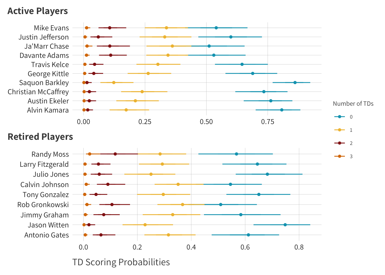 I love watching football and learning about football, with most of my working time spent listening to various NFL podcasts and the Learning Bayesian Stats podcast.1 For the last few years, I have had an inherent fascination with Bayesian stats. One of the great things about Bayesian stats is that we can talk about uncertainty in a more intuitive way, and because of the mechanics of using Bayesian models, we can get some awesome-looking plots.2 So combining these two interests would make for an interesting blog post.