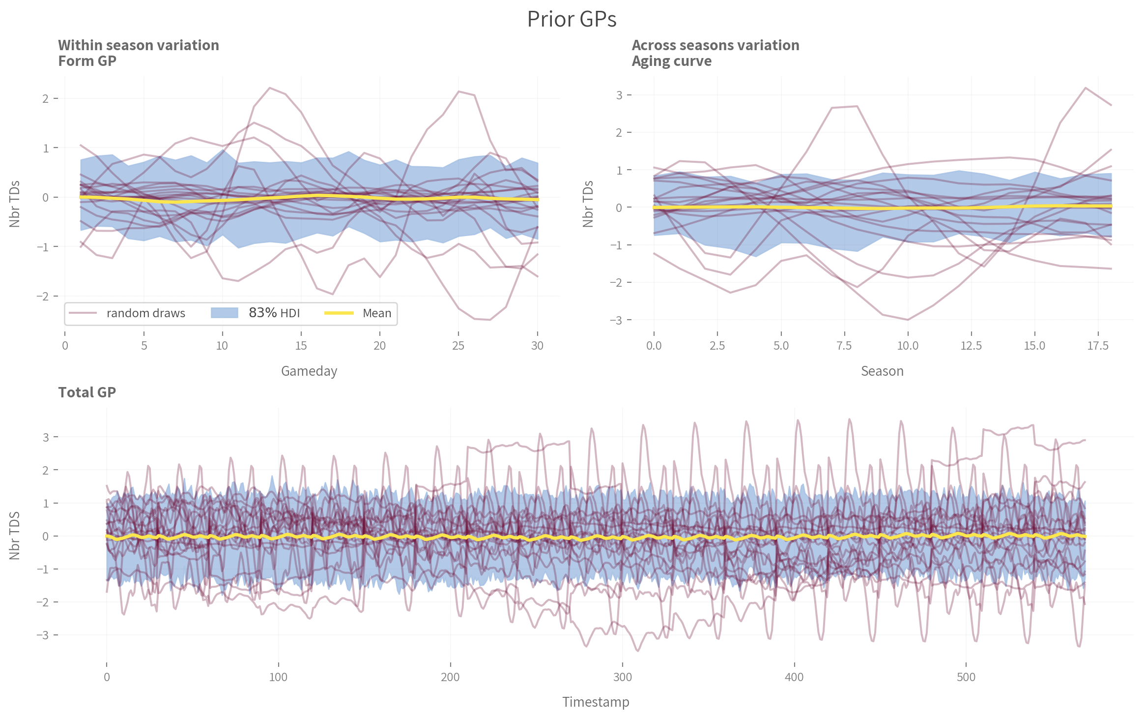 Technically, when you are talking about a lengthscale in general, we are talking about setting the priors over how quickly the correlations between function values decay. One of the nice things about the PyMC universe is that they have made setting the priors and hyperparameters of an HSGP more intuitive. So, while thinking about the prior for the variable may technically be a bit wrong in practice, it was helpful to do it when setting priors for the in-season HSGP and the experience HSGP.