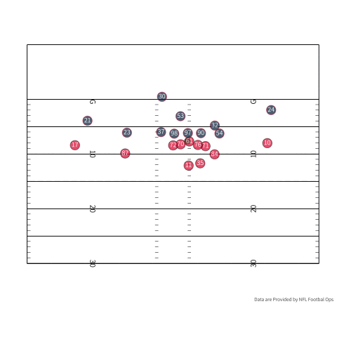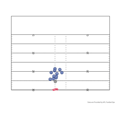 Outside of my pretend team, TDs could also serve to tap a pass catcher’s latent ability. To be a good pass catcher in the NFL, you have to combine being a good route runner, athleticism, and the ability to catch the ball. You could argue that being a good pass catcher becomes more difficult when a team gets closer to the endzone. If we use some real player tracking data provided by the NFL we can see some of the difficulties of being a receiver in the endzone. If we look at the person who actually catches the touchdown, there are three defenders in the area if we count the corner playing Tyreek Hill. If we turn our attention to the outlet pass (number 35 in red) there are three defenders in the area when he slips out to make himself available.